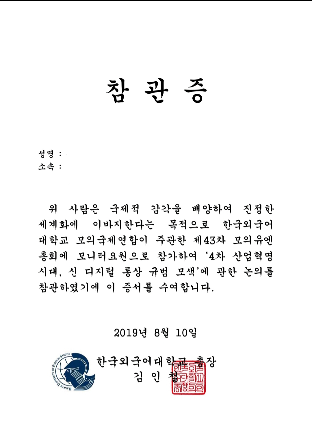 갓 1학년 되신 분들, 어리신 분들이 매우 많으셨는데도 이분들의 외국어 수준에 감탄할 수밖에 없었고, 어떻게 하면 외국어를 저렇게 잘할 수 있지? 라는 감탄이 떠나가질 않았습니다. 저도 외국어를 다시 한번 잘해봐야겠다는 동기부여도 받았습니다. 다음 44차 모의유엔도 참관 기회만 주어진다면, 참관하고 싶네요! 즐거웠고 새로운 경험을 할 수 있어서 만족했습니다. 비록 참관자 신분이었지만, 외대 행사에 참여한 것만으로도 행복했습니다 ㅋㅋㅋㅋ
